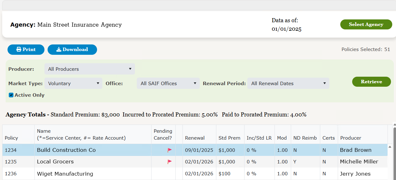 Starting in early January, we implemented an enhancement to the book of business information in the agent online portal. Policies with a pending cancellation status will be marked with a red flag for easy identification. As a reminder, you can also sort columns in the Book of Business tab by pending cancellation status, alphabetical order, renewal date, policy number, or premium.